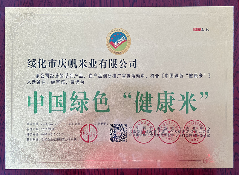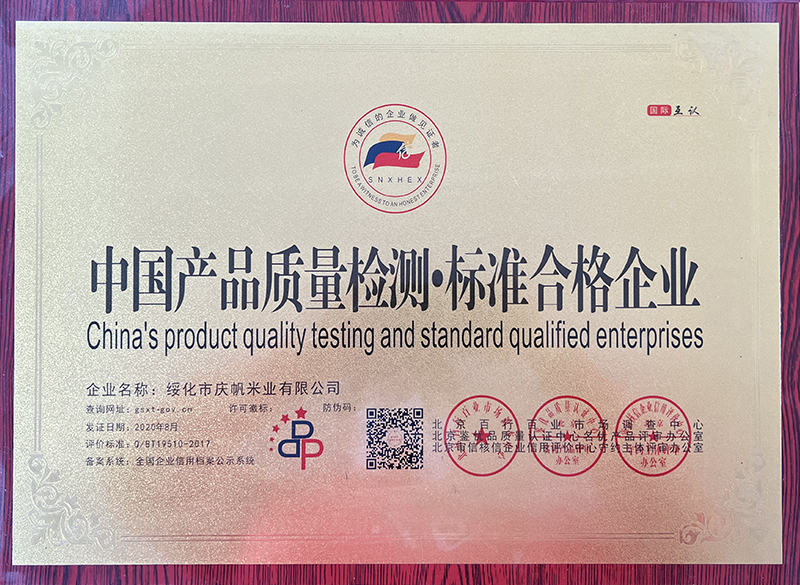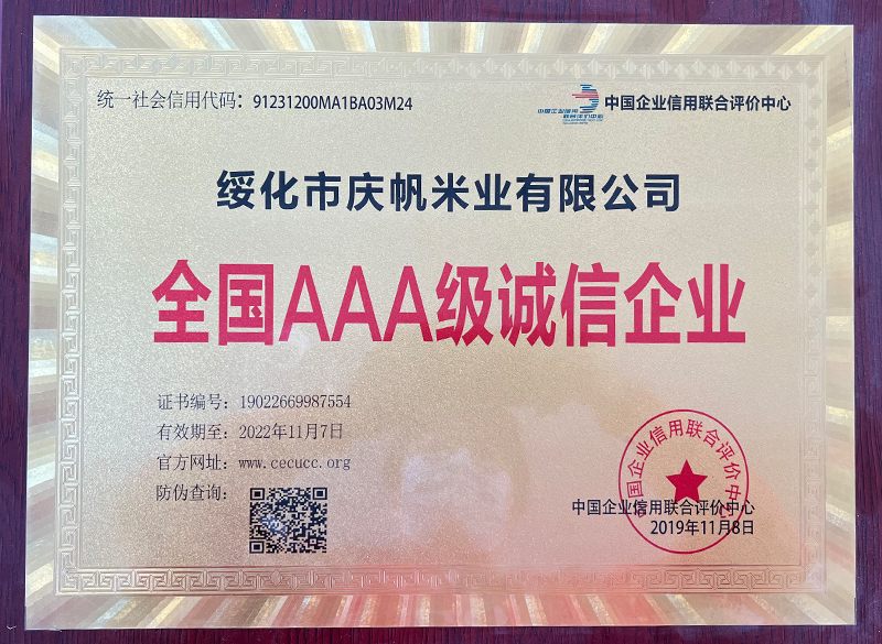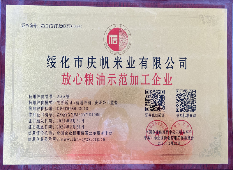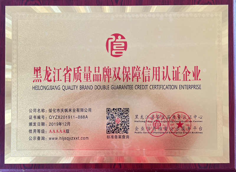 關于慶帆米業(yè) 客戶至上 品質優(yōu)良 您現(xiàn)在的位置:網(wǎng)站首頁 > 關于我們 > 資質榮譽 企業(yè)文化 CORPORATE CULTURE 資質榮譽 HONOR 領導致辭 LEADER’S SPEECH 公司簡介 COMPANY PROFILE 黑龍江省質量品牌雙保障信用認證企業(yè) 放心糧油示范加工企業(yè) 綠色品牌 中國綠色“健康米” 全國AAA級誠信企業(yè) 中國產品質量檢測標準合格企業(yè) 共15條記錄 當前為第2頁/共3頁上一頁123下一頁